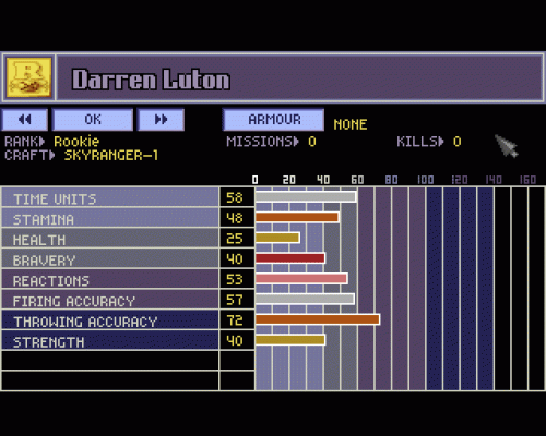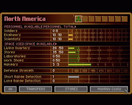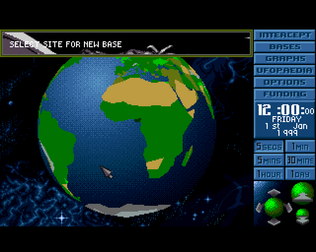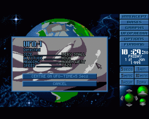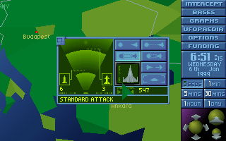 X-COM: UFO Defense is a strategy game featuring separate but interlinked elements. On the strategic side, called GeoScape, you get a rotating view of the globe, where you see all visible UFOs (those that are within your detection range) as well as major cities and your base(s). You order movements from here, such as sending out fighters to intercept UFOs, transports with soldiers to assault/recover UFOs, and perhaps assaults on alien bases (if you find any). You also control your research, as you must invent better weapons (the Terran weapons are just no match against the alien weapons) quickly, not to mention all the other cool tech you can recover from the aliens. You also need to control your budget, as you can't afford to overextend your reach. Researchers need to be paid, engineers (who build the new toys) need to be paid, base(s) need to be be built/expanded, planes need to be bought/maintained, supplies need to be replenished, and so on.