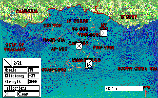 'Nam 1965-1975 is a strategy game set during the Vietnam war. The player takes the role of both the President of the United States and the commander-in-chief, and the goal of the game is to prevent the South of Vietnam to fall in the hands of the Vietcong, managing its military resources and preventing the public opinion to reject the war. As President, the player has to manage the military resources, and as Commander in chief they can take direct decisions on the terrain, such as tactics or engaging enemies.