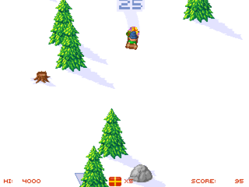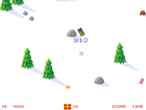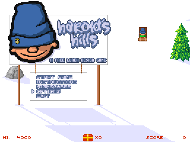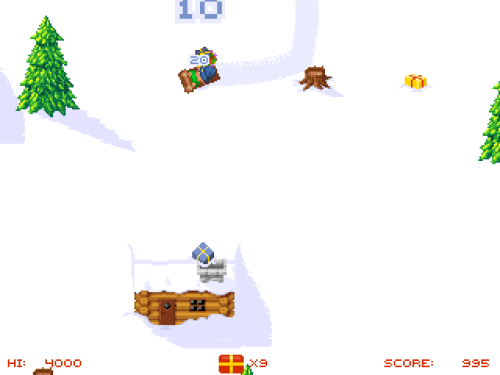 The player controls Harold as he slides down a snowy hill with a toboggan; maneuver him left and right to pick up presents from the snow, while avoiding obstacles such as trees and boulders. Delivering presents to homes will result in bonus scores, the more presents delivered in one shot the bigger the bonus, but carrying more presents also means you'll slide faster. Oddly enough it is possible to gain bonus points hitting stumps; hitting them in rapid succession will give cumulative bonuses, but this is tricky because the toboggan will deflect.
