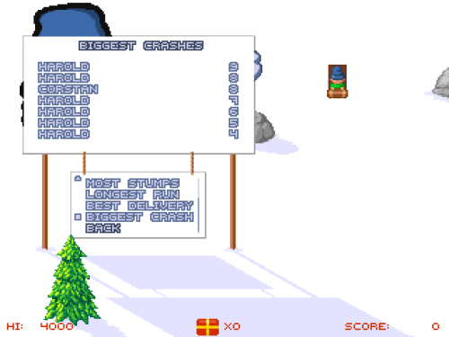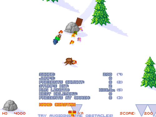 A final noteworthy feature is the high score table system. The game will track several things like most presents delivered, most stumps hit, most undelivered presents crashing, and of course general high score.