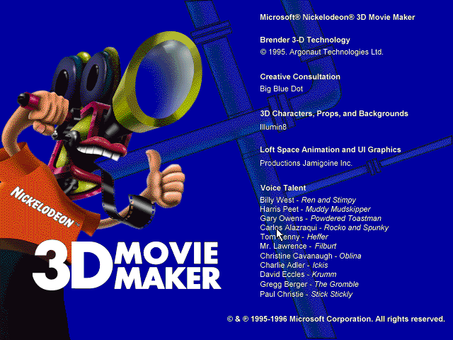 Nickelodeon 3D Movie Maker is a Nickelodeon-themed version of 3D Movie Maker. This spin-off includes 12 characters and 11 unique scenes from Rocko's Modern Life, The Ren & Stimpy Show and Aaahh!!! Real Monsters, with Stick Stickly serving as a guide. An unofficial expansion pack was later created, allowing Nickelodeon actors, props, scenes, music and sounds to be used in the original 3D Movie Maker