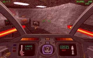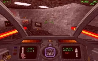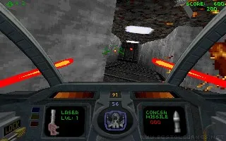 Descent is a 3D first-person game that puts the player at the controls of the Pyro-GX spaceship. Descent is notable in that the player travels through various interior locations (mines) but can do so in 720 degrees of movement. The ship however only moves forward and backward in any of the directions it is facing. The ship is able to use a variety of weapons scattered as power-ups throughout each level. They include: standard lasers, the Vulcan Cannon (a chaingun-like weapon), the Spreadfire Cannon (a rapidly firing, shotgun-like energy weapon), the Plasma Cannon (a rapidly firing energy weapon more suited for medium-range combat), and the Fusion Cannon (fires a ball of energy that's more powerful the longer it is charged it up, but could destroy the ship). All of these weapons, except for the Vulcan Cannon, use the ship's energy supply. The Pyro-PX is also capable of firing regular concussion missiles, homing missiles, proximity bombs (sits in the sky, then explodes when something gets close to it), smart missiles (more powerful homing missiles that fire out homing energy balls upon impact with their target), and Mega Missiles (the ultimate weapons of mass destruction).