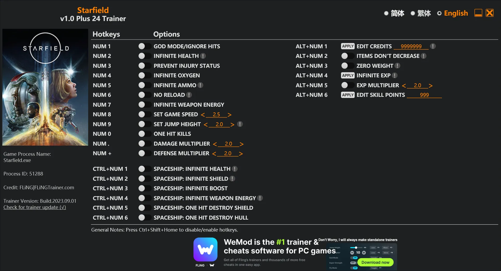 - Ctrl+Num 1 – Spaceship: Infinite Health
